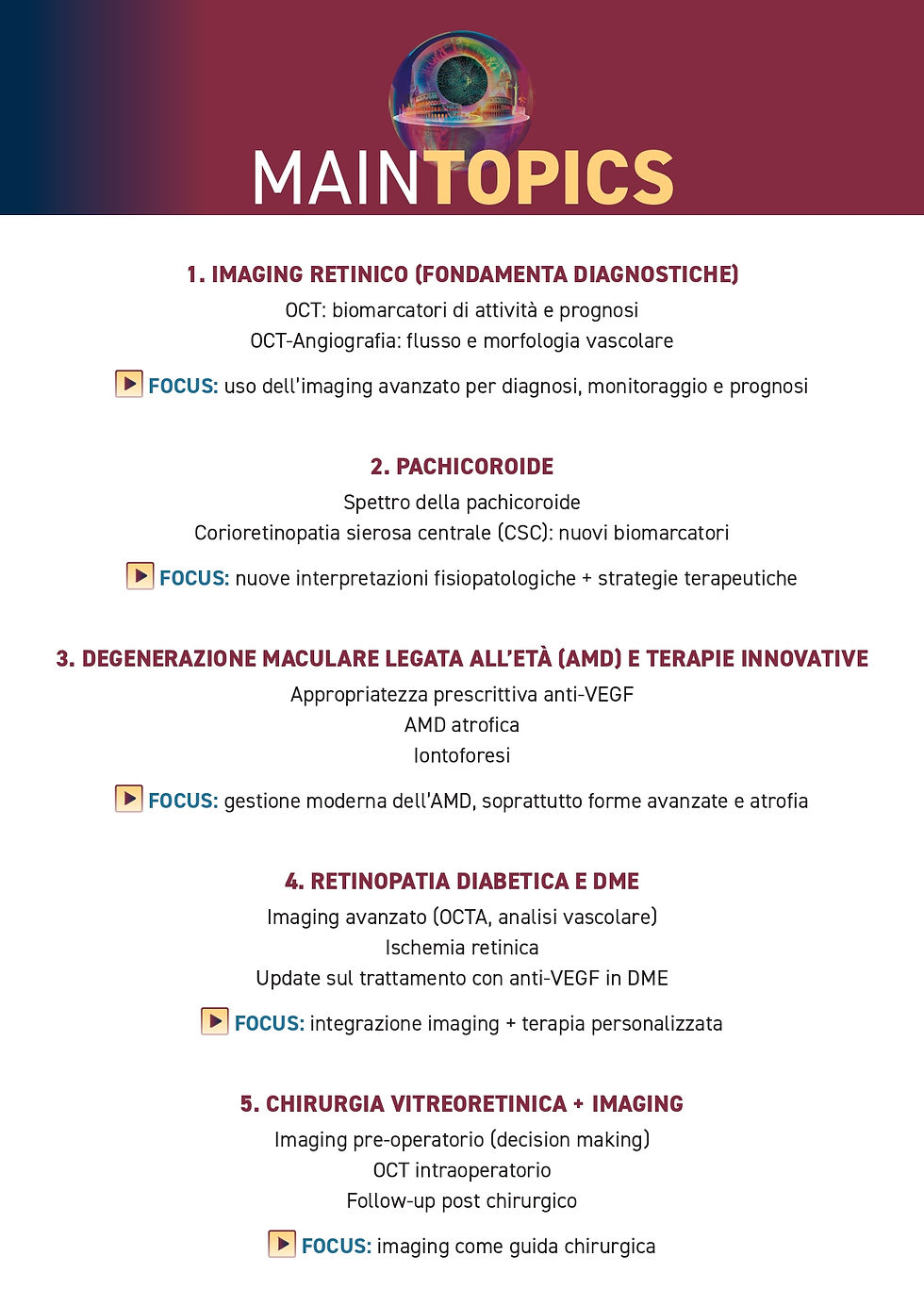 Un’intera giornata dedicata alle più avanzate tecnologie di imaging retinico, alle nuove frontiere nella gestione della degenerazione maculare, della retinopatia diabetica e della pachicoroide, fino alle innovazioni in chirurgia vitreoretinica.